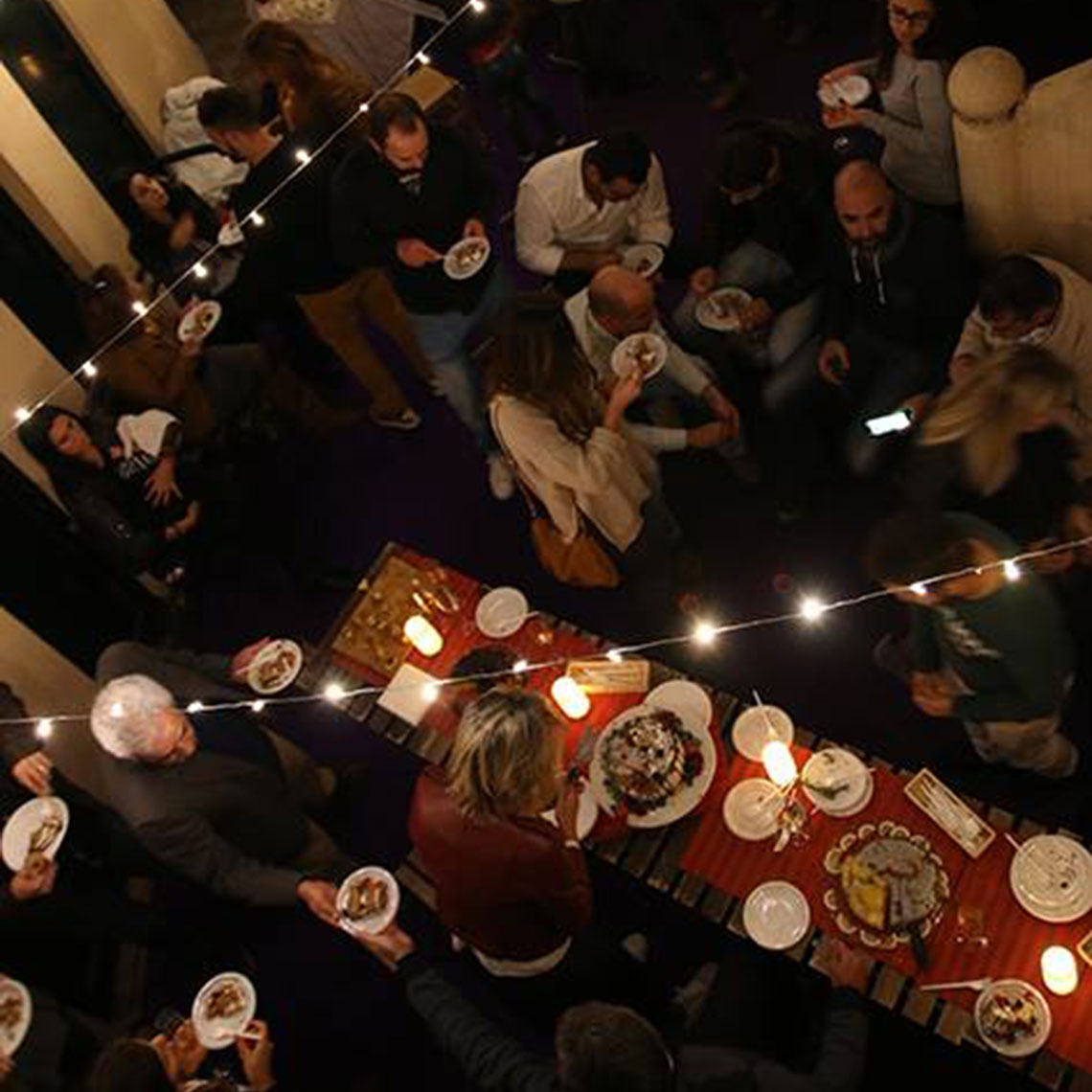 • Mesa com bolos, pratos brancos e velas, pessoas em volta servindo-se em ambiente interior acolhedor